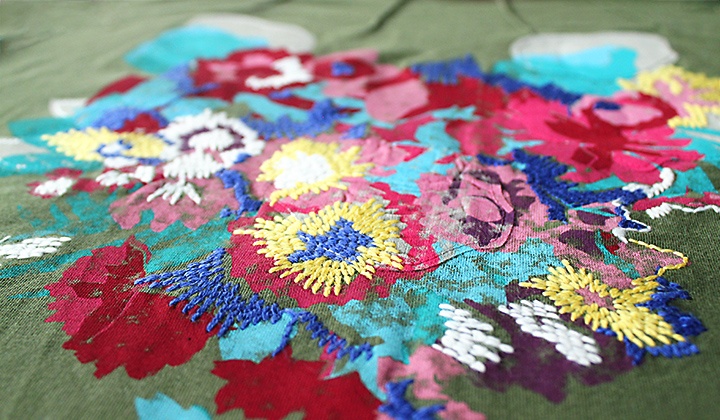 Tipo de bordado mais comum, que conjuga muitas vezes diferentes pontos e aplicações de tecido.